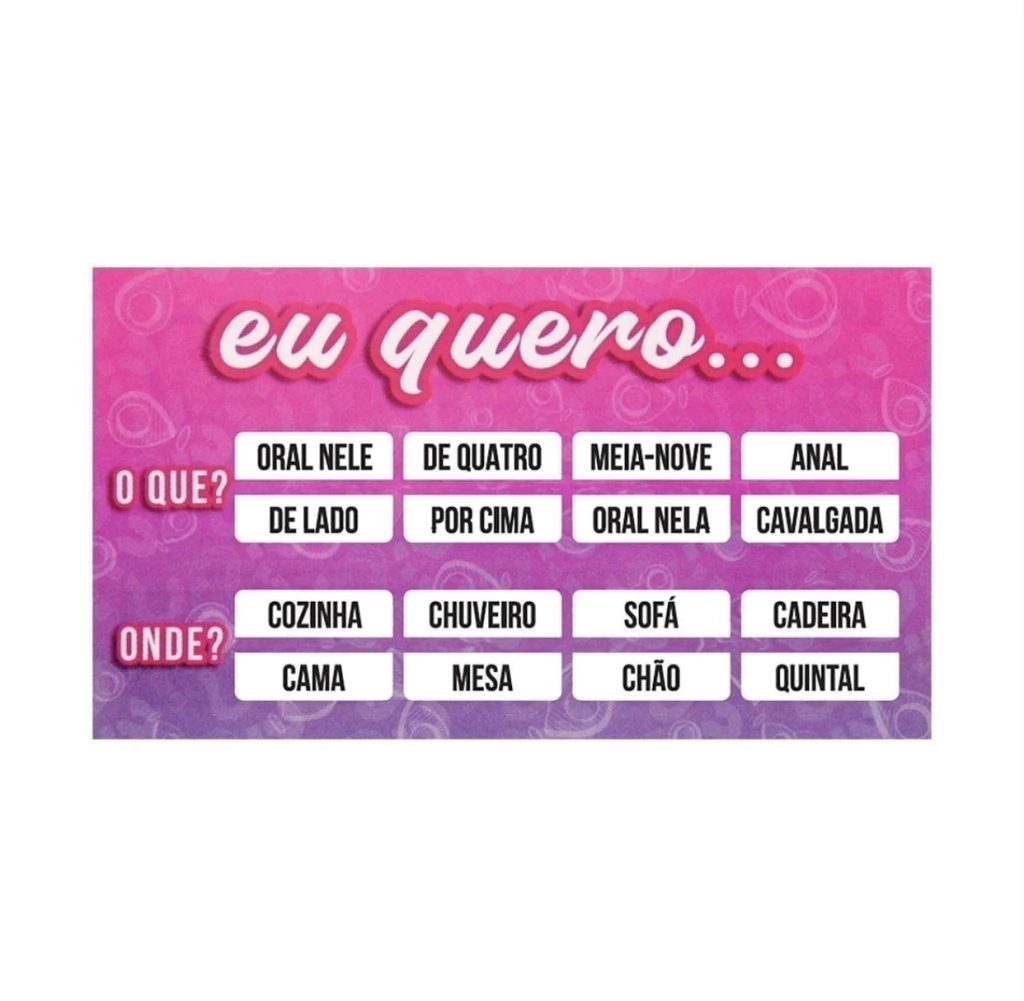 Raspadinha Erótica é uma maneira divertida e excitante onde você e seu parceiro (a) vão jogar juntos, um de cada vez deve raspar um dos quadradinhos e executar a tarefas propostas.